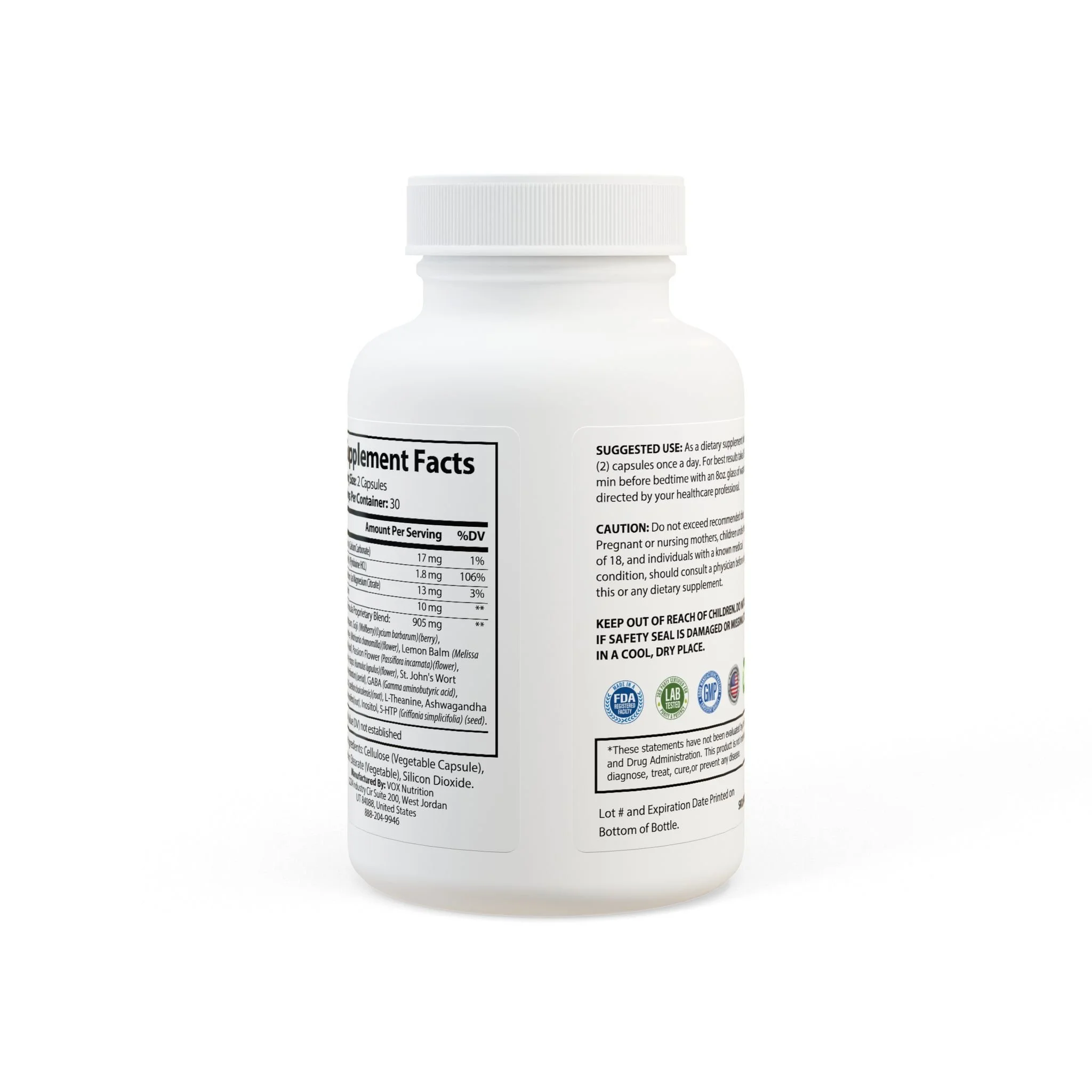 ocinalis) (aerial), Passion Flower (Passiora incarnata)(ower), L-Taurine, Hops (Humulus lupulus)(ower), St. John's Wort (Hypericum perforatum (aerial), GABA (Gamma aminobutyric acid), Skullcap (Scutellaria baicalensis)(root), L-Theanine, Ashwagandha (Withania somnifera)(root), Inositol, 5-HTP (Grionia simplicifolia) (seed). Inactive Ingredients: Cellulose (Vegetable Capsule), Magnesium Stearate (Vegetable), Silicon Dioxide.